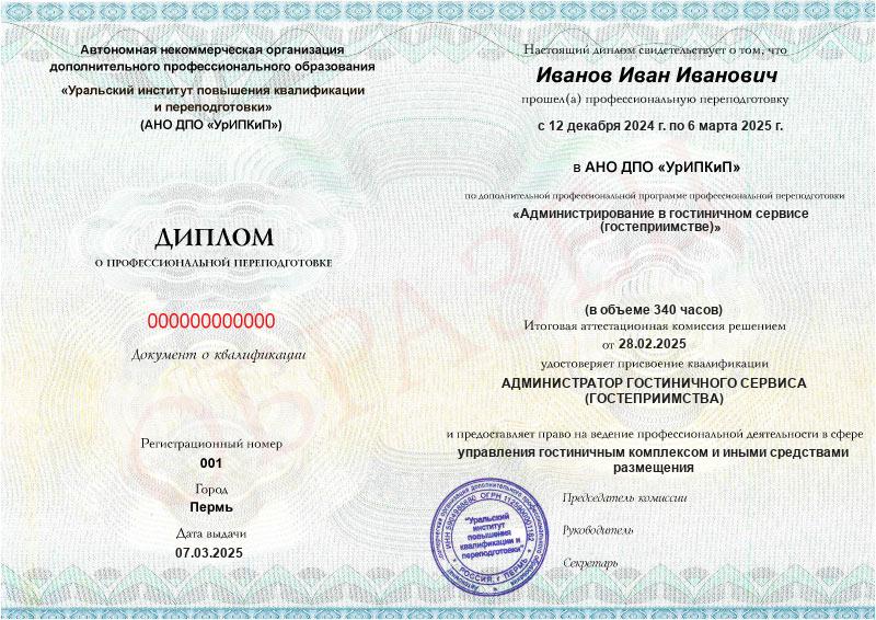 - Квалификация: Администратор гостиничного сервиса (гостеприимства)