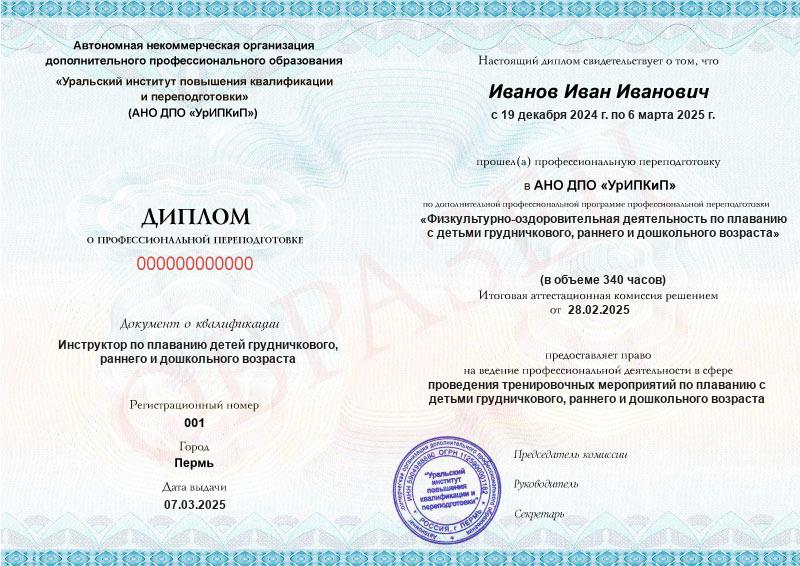 • Квалификация: Инструктор по плаванию детей грудничкового, раннего и дошкольного возраста