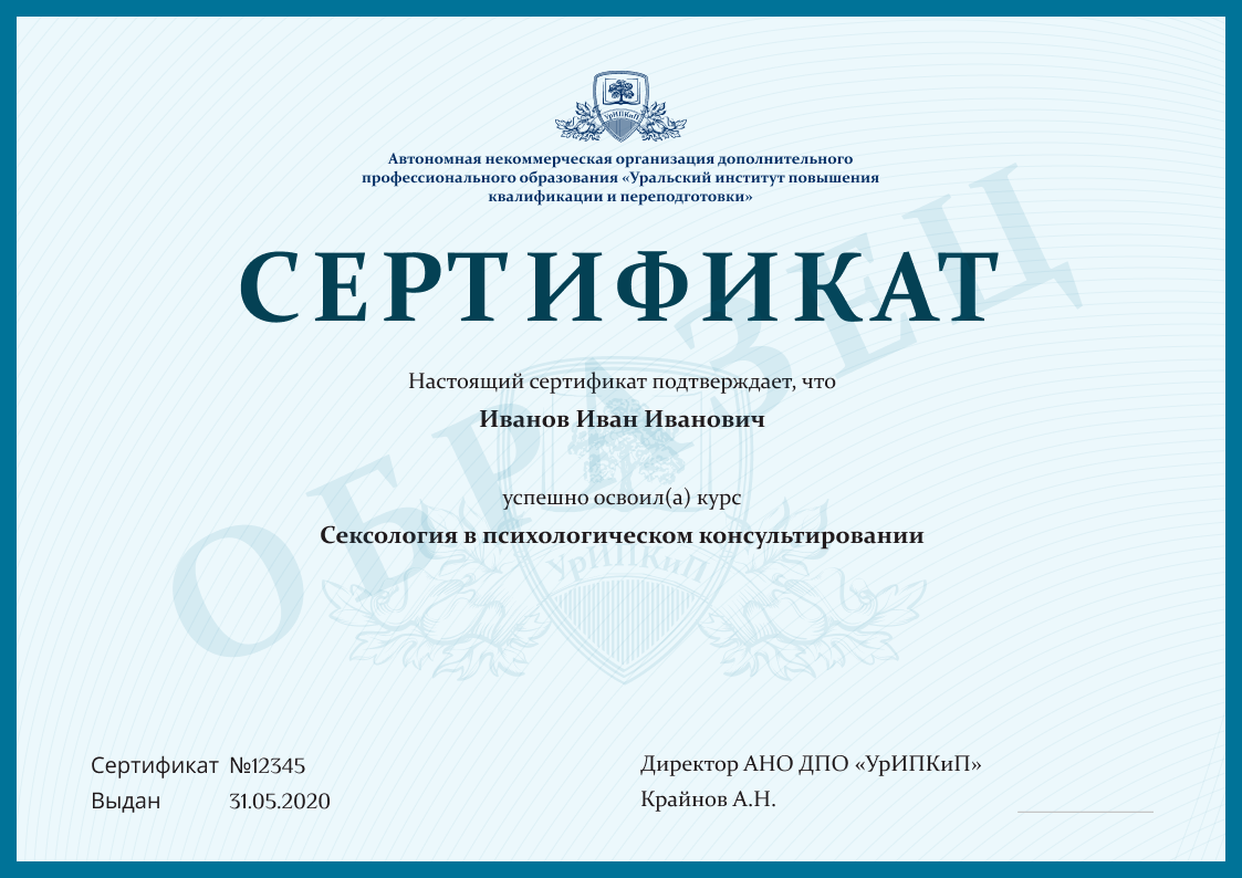 Заполненные образцы выдаваемых документов есть в описании учебных курсов и на странице «Лицензия. Документы», а также на главной странице официального сайта АНО ДПО «УрИПКиП».