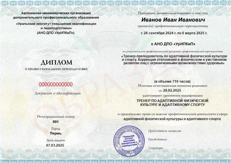 • Квалификация: Тренер по адаптивной физической культуре и адаптивному спорту